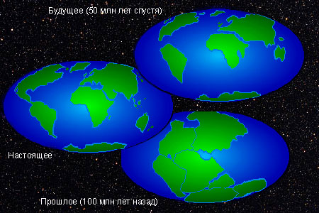 Сейчас считается, что 300–200 миллионов лет назад существовал единый суперматерик Пангея. Затем он распался на части, которые сформировали нынешние материки. |