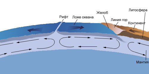 | В 1960 году американский геолог Гарри Хесс предположил, что горячая мантия поднимается под срединно-океаническими хребтами, распространяется в стороны от них, разрывая и расталкивая литосферные плиты. Вещество мантии заполняет образовавшиеся трещины – рифты. «Уничтожение» же участков поверхности Земли происходит, скорее всего, вблизи океанских желобов. |