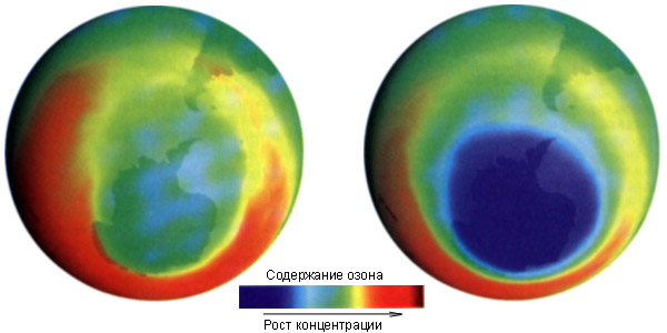 | Земная атмосфера не пропускает жесткое коротковолновое излучение. Одним из важнейших газов, поглощающих ультрафиолетовые лучи, является озон. Из-за ухудшения экологической обстановки, прежде всего, из-за выброса в атмосферу фреона и других активных веществ, его количество резко уменьшилось, над Антарктидой и некоторыми другими районами Земли образовались озоновые дыры. Справедливости ради заметим, что существует другое мнение, заключающееся в том, что озоновые дыры – одно из проявлений солнечной активности. |