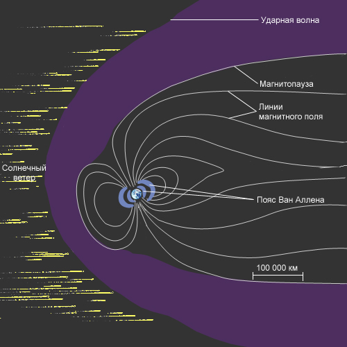 | Силовые линии магнитного поля Земли образуют своеобразные ловушки для движущихся к ней потоков частиц солнечного ветра. Задержанные магнитным полем частицы образуют радиационные пояса. |