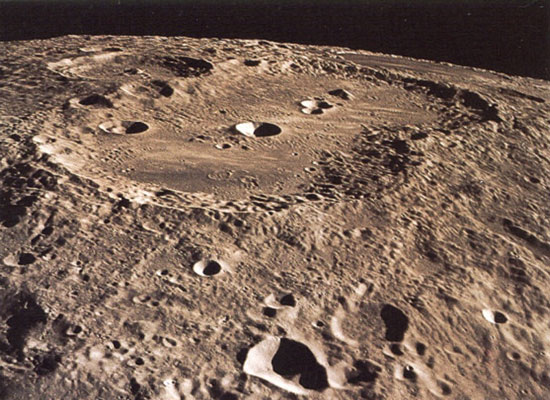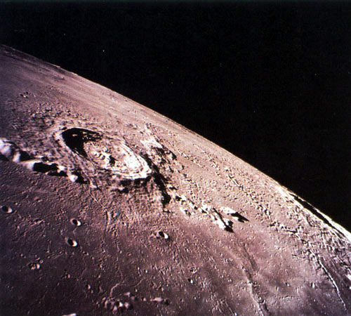 Кратер Эратосфен диаметром 61 км образовался относительно недавно. На горизонте виден другой молодой кратер – Коперник. |