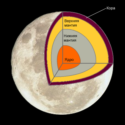 Плотность Луны сравнима с плотностью земной мантии. Поэтому у Луны либо нет, либо очень незначительное железное ядро. Внутреннее строение Луны изучено по сейсмическим данным, переданным на Землю приборами космических экспедиций «Аполлон». Толщина коры Луны 60–100 км. Толщина верхней мантии 400 км. В ней сейсмические скорости зависят от глубины и уменьшаются в зависимости от расстояния. Толщина средней мантии около 600 км. В средней мантии сейсмические скорости постоянны. Нижняя мантия расположена глубже 1100 км. Ядро Луны, начинающееся на глубине 1500 км, возможно, жидкое. Оно почти не содержит железа. Поэтому Луна имеет очень слабое магнитное поле, не превышающее одной десятитысячной доли земного магнитного поля. Зарегистрированы местные магнитные аномалии. |