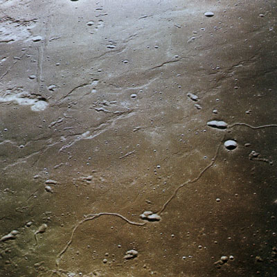Мощная литосфера толщиной около 1000 км исключает разломы и выход лавы на поверхность. Но раньше, миллиарды лет назад, на Луне были извержения вулканов. |