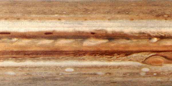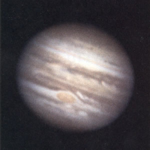 Даже в небольшой телескоп хорошо видно полярное сжатие Юпитера и полосы на его поверхности, параллельные экватору планеты. Видимая поверхность Юпитера представляет собой верхний уровень облаков, окружающих планету. Благодаря этому Юпитер имеет сравнительное высокое альбедо (0,45), а детали на его поверхности постоянно меняют свой вид. |