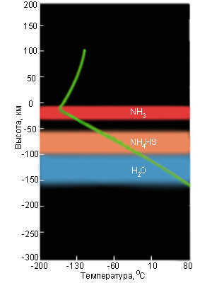 | Атмосферы Юпитера и других газовых планет характерны ветрами больших скоростей, дующих в пределах широких полос, параллельных экватору планеты, причем в смежных полосах на Юпитере ветра направлены в противоположные стороны. Эти полосы различимы даже в небольшой телескоп и находятся в постоянном движении. Ветры на Юпитере достигают скорости 500 км/ч. | |