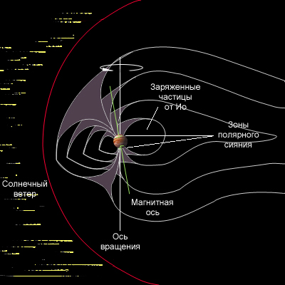 Магнитное поле Юпитера огромно, даже в пропорции с величиной самой планеты – оно простирается на 650 миллионов километров (за орбиту Сатурна!). Если магнитосфера его была бы видима, она бы с Земли имела угловой размер, равный размеру Луны. |